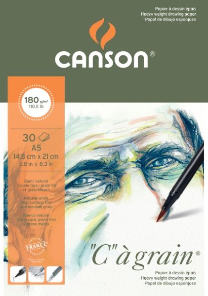 O papel “C” à grain® é ideal para desenhar, graças a sua textura fina, que não é muito lisa nem muito proeminente, permitindo efeitos de relevo e resultados delicadamente equilibrados. Fabricado usando apenas alfacelulose, não contém absolutamente nenhuma lignina, uma substância que poderia acelerar o amarelecimento do papel ao longo do tempo. É um papel naturalmente branco, sem aditivos de brilho óptico, sem ácido e permanente, atende a todos os requisitos da norma ISO 9706. Gelatinado em massa e em superfície, tornando-o resistente a sucessivas operações de correção ou raspagem sem descamar. Um papel versátil, é adequado para todas as técnicas secas e certas técnicas úmidas, como tinta e guache.