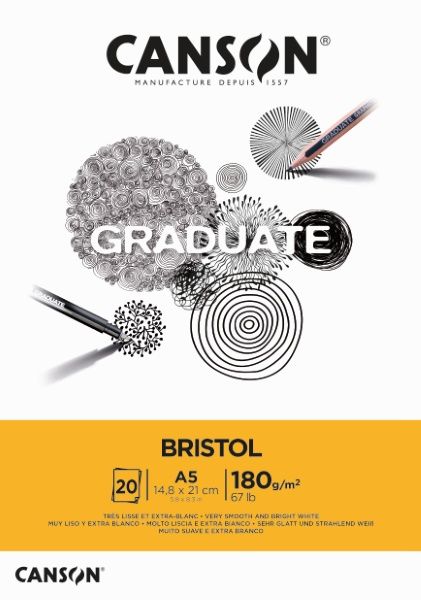 Os blocos Canson Graduate Bristol possuem papel extra branco, com gramatura de 180 g/m2 e superfície ultra lisa. Ideais para desenhos de precisão, são perfeitos para uso com lápis e marcadores, graças à resistência do papel.