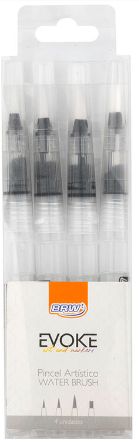 Desc.: Pincel Evoke Water Brush c/4 Ref. BP0300 Ref: BP0300 Cod.Fab.NF.: BP0300 Material/Modelo: Gramatura: Tamanho: Capacidade: Cor: Cod.Bar.Unitário: 7898419163538 Marca: BRW QTD por Pacote: 4 Unidades Cod. Bar. Pacote: 7898675509224 QTD por Caixa: 24 Blister QTD Caixa Master: 192 Blister Informações Adicionais: O Pincel Artístico Water Brush BRW é um acessório prático para artistas profissionais, amadores e entusiastas. Com quatro diferentes tamanhos de pincel, é possível explorar os mais diversos campos de ilustração e pintura de maneira prática e bem versátil! Seu corpo é composto por três peças: depósito transparente de 6mL; ponta resistente com cerdas sintéticas macias e flexíveis; e tampa para proteção contra sujeiras. Conta com tamanho compacto, ergonômico, portátil e de fácil manuseio, o que o torna uma ótima opção para levar em viagens ou para realização de urbans sketchings. Para diferentes efeitos, seu reservatório pode ser preenchido com água, tinta aquarela líquida ou nanquim. Além disso, pode ser utilizado como pincel comum somente molhando as cerdas na água. Seu traço varia de acordo com a pressão colocada e a quantidade de líquido distribuído sob o papel, sendo perfeito para técnicas tanto secas quanto úmidas. É ideal para uso com lapis aquareláveis, tintas aquarelas e tintas guache.