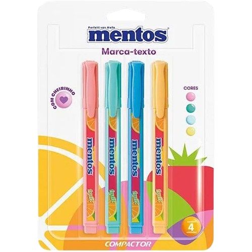 Desc.:Pincel Marca Texto Mentos 4 Cores c/Cheirinho Cod. Fab.: 002923660 Material/Modelo: Tamanho: Capacidade: Cor: Cod.Bar.Unitário: Marca: Compactor QTD por pacote: Cod. Bar. pacote: QTD por caixa: Cod. Bar. Caixa: QTD caixa Master: Cod. Bar. Caixa Master: Informações Adicionais: